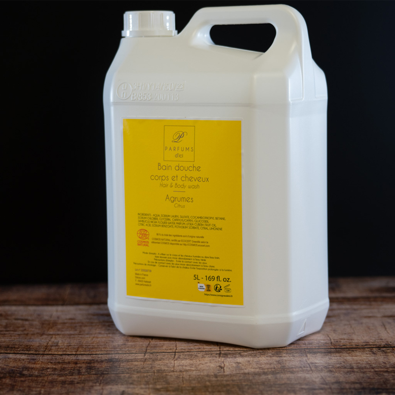 Optez pour l’excellence de la cosmétique écologique en vrac ! Notre Gel Corps & Cheveux Agrumes en bidon de 5 litres est la solution idéale pour le remplissage, certifiée COSMOS NATURAL et valorisant le savoir-faire français.