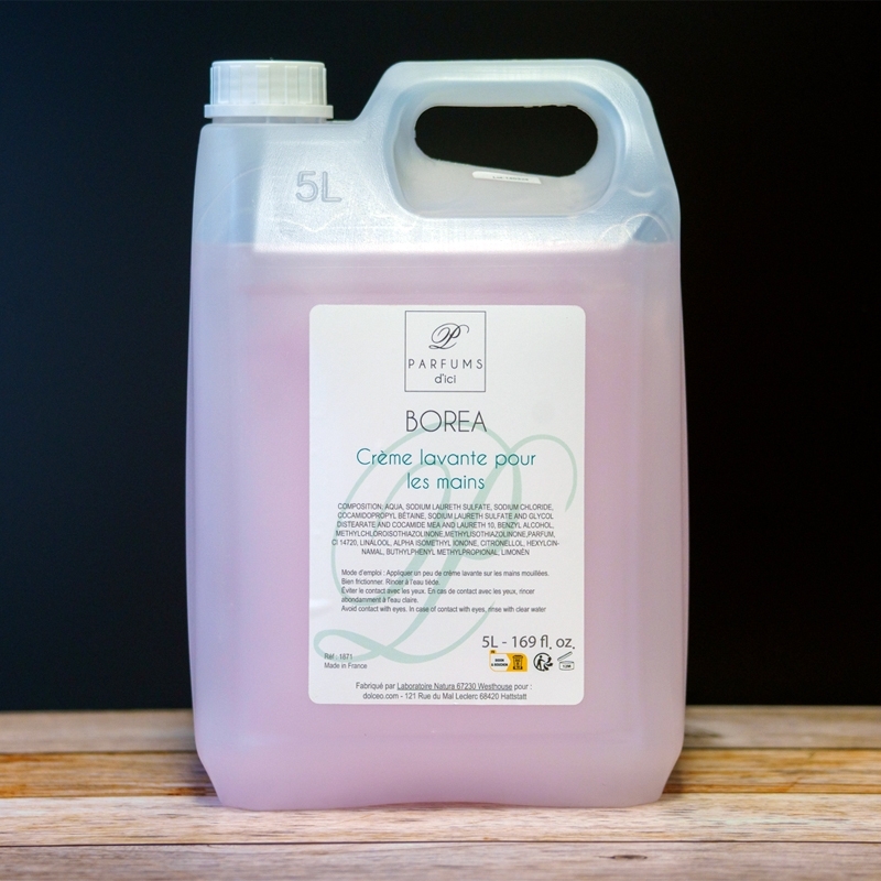 Crème Lavante Mains Borea (5 Litres) – Formule Professionnelle Économique pour Hôtels Offrez à vos clients une expérience de lavage des mains à la fois tonique et luxueuse avec la Crème Lavante Mains « Borea » de la gamme Parfums D’ici.